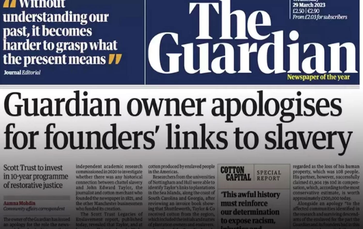 Scott Vakfı, Guardian ve kurucularının insanlığa karşı bu suçta sahip oldukları rolün yanı sıra pamuk endüstrisini ve dolayısıyla köleleştirilmiş insanların sömürüsünü desteklemeye hizmet eden erken editöryal pozisyonları için de özür diledi.
