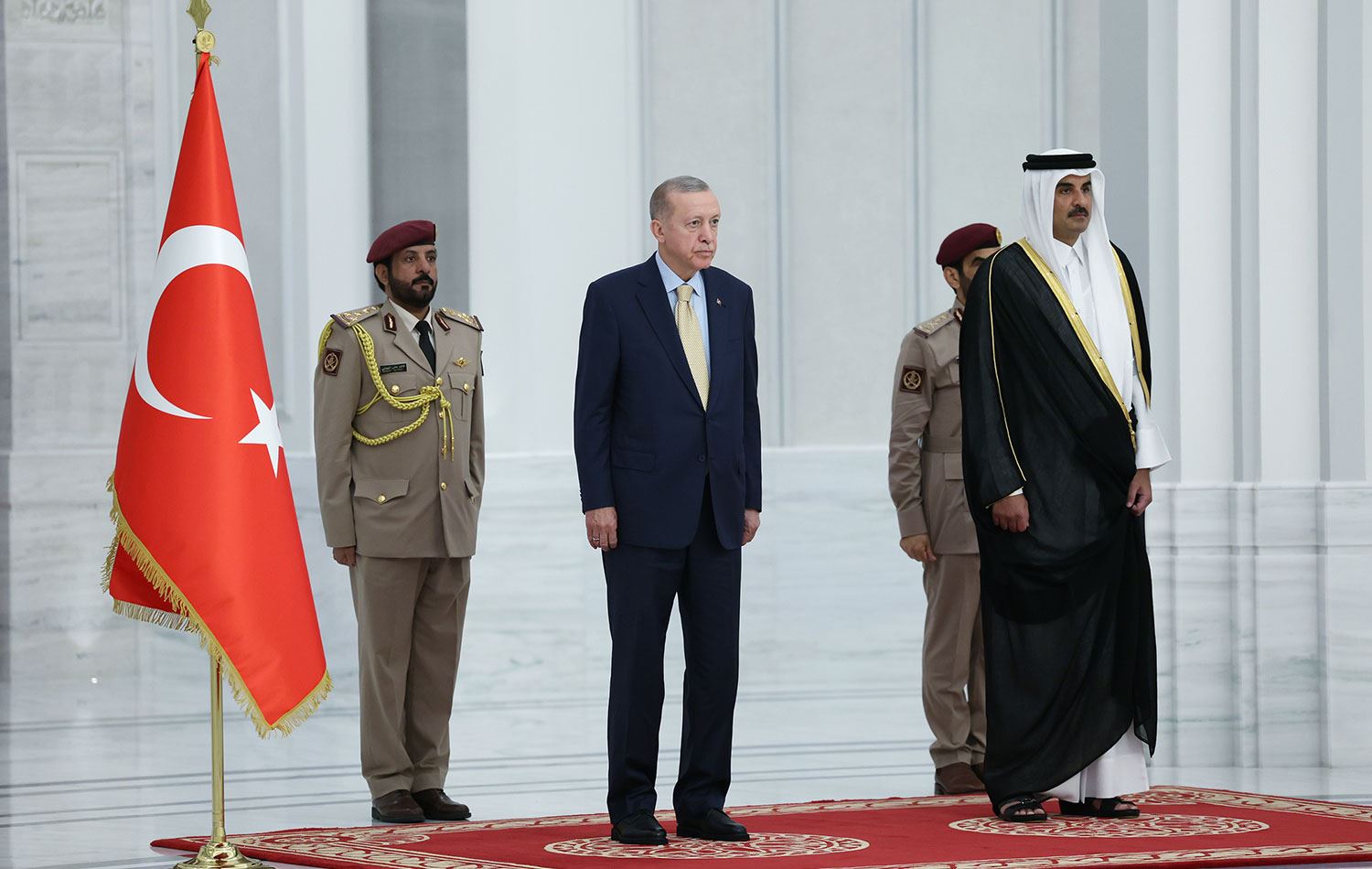 Katar Emiri Al Sani, Lusail Sarayı'na gelişinde Erdoğan'ı karşıladı. Cumhurbaşkanı Erdoğan ve Al Sani'nin tören alanındaki yerlerini almasının ardından iki ülke milli marşları çalındı.