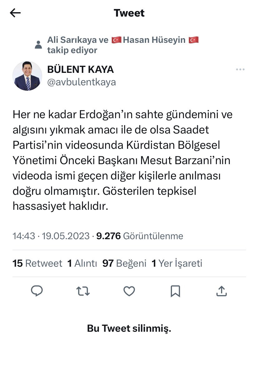 Kaya ilk önce “Her ne kadar Erdoğan’ın sahte gündemini ve algısını yıkmak amacı ile Saadet Partisinin videosunda Kürdistan Bölgesel Yönetimi önceki Başkanı Mesut Barzani’nin videoda adı geçen diğer isimlerle anılması doğru olmamıştır. Gösterilen tepkisel hassasiyet önemlidir” paylaşımında bulunarak partisini eleştirdi.