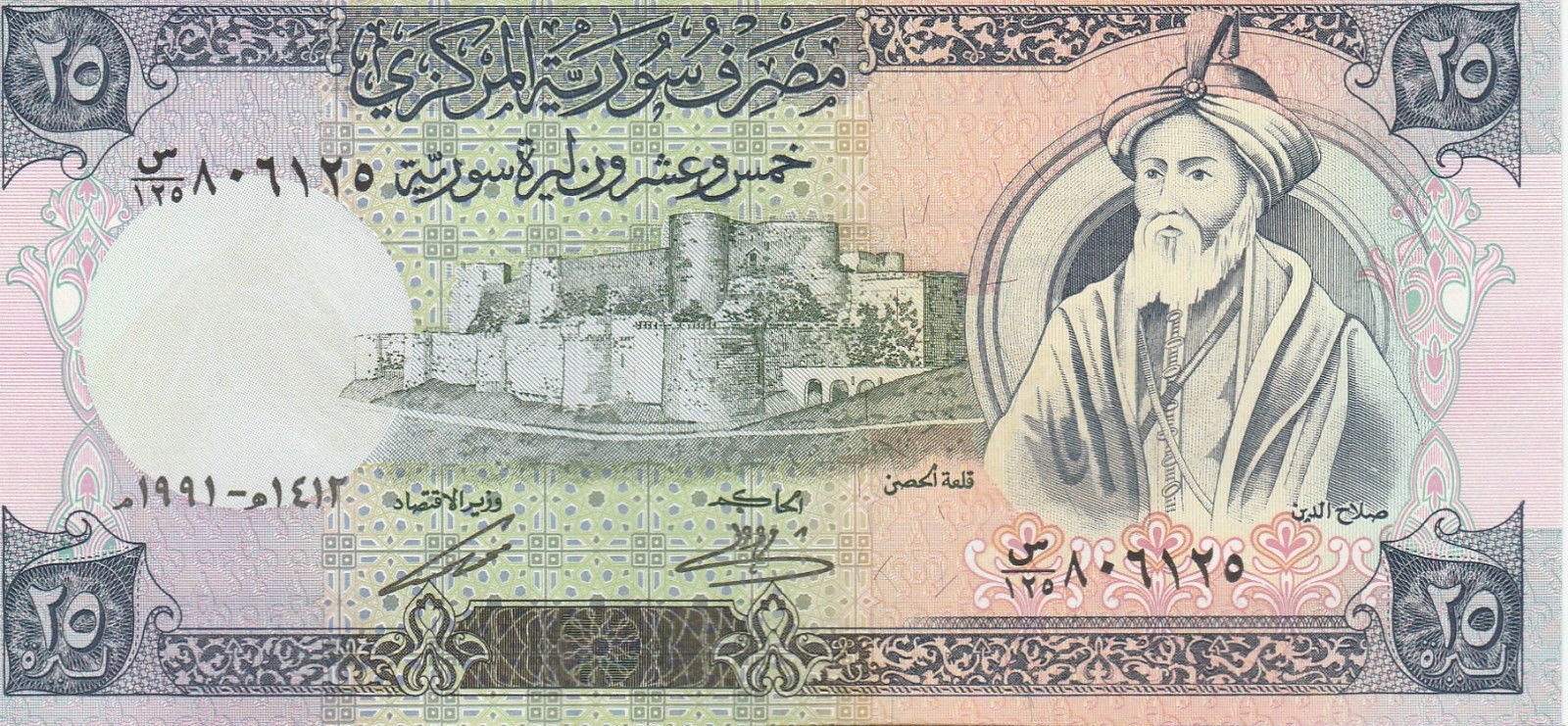 1991 tarihli 25 Suriye Lirası parasında Selahaddin Eyyübi ve Kürt Kalesi’nin çizimi yer alıyor