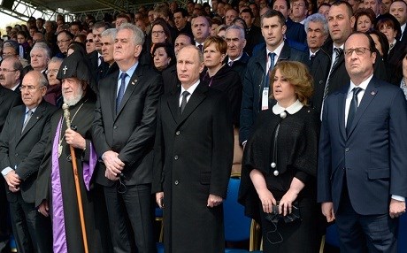Kiliselerde çanların çalınması ardından Fransa Cumhurbaşkanı François Hollande, Rusya Devlet Başkanı Vladimir Putin, Sırbistan Cumhurbaşkanı Tomislav Nikolic, Rum kesimi lideri Nikos Anastasiadis'in yanı sıra diğer ülkelerden devlet başkanları ve başbakanlar, bakanlar ve ülke heyetleri, Ermenistan Devlet Başkanı Serj Sarkisyan ile tokalaştıktan sonra ellerinde "soykırım"ı sembolize eden çiçekleri çelenge bıraktı.