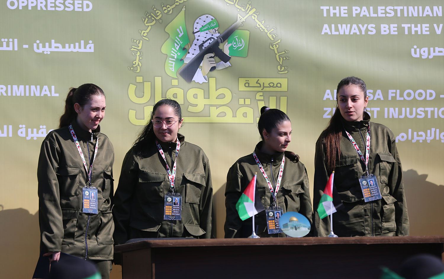 Üzerlerinde askeri üniforma ve boyunlarına asılı yaka kartlarıyla sahneye çıkan 4 İsrailli kadın rehine, burada bekleyenleri selamladı.