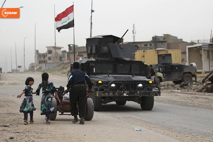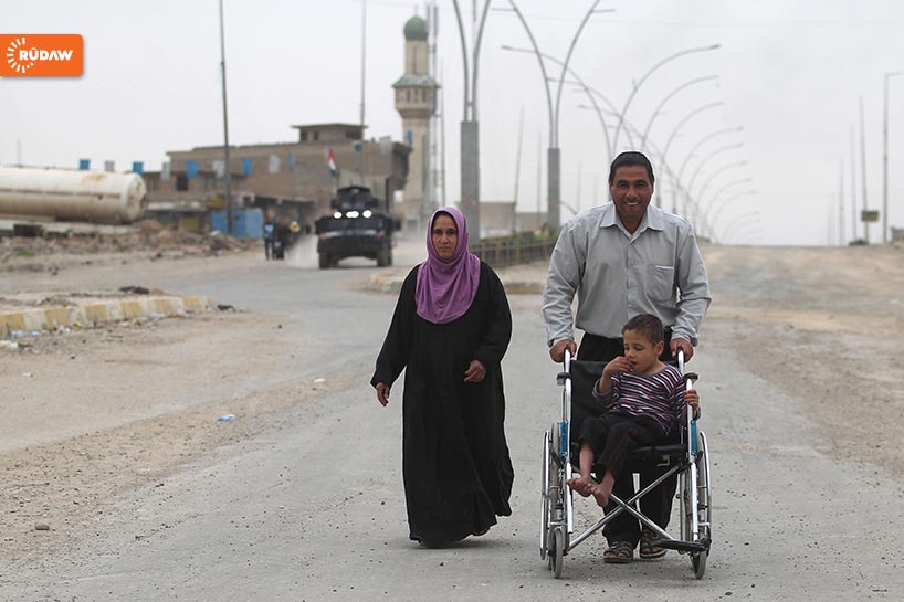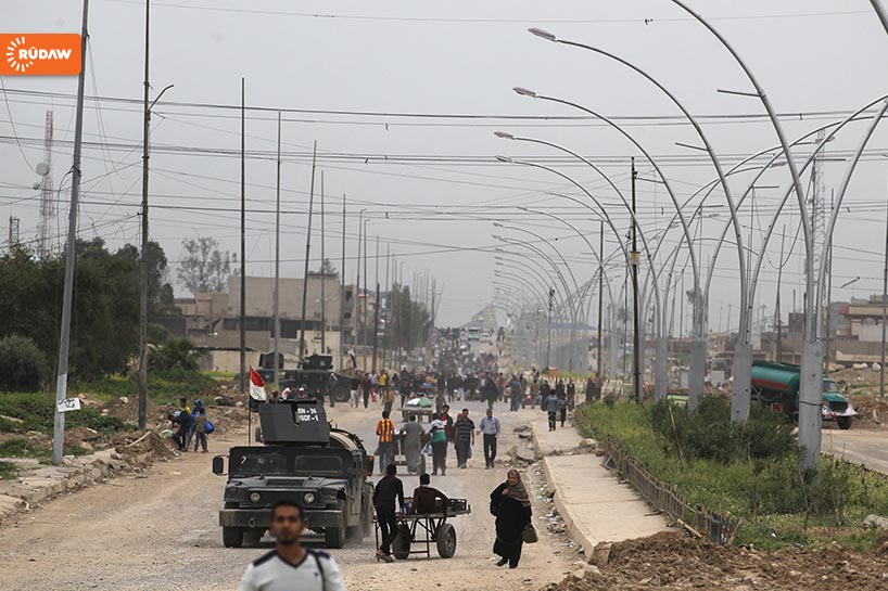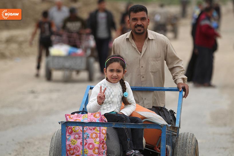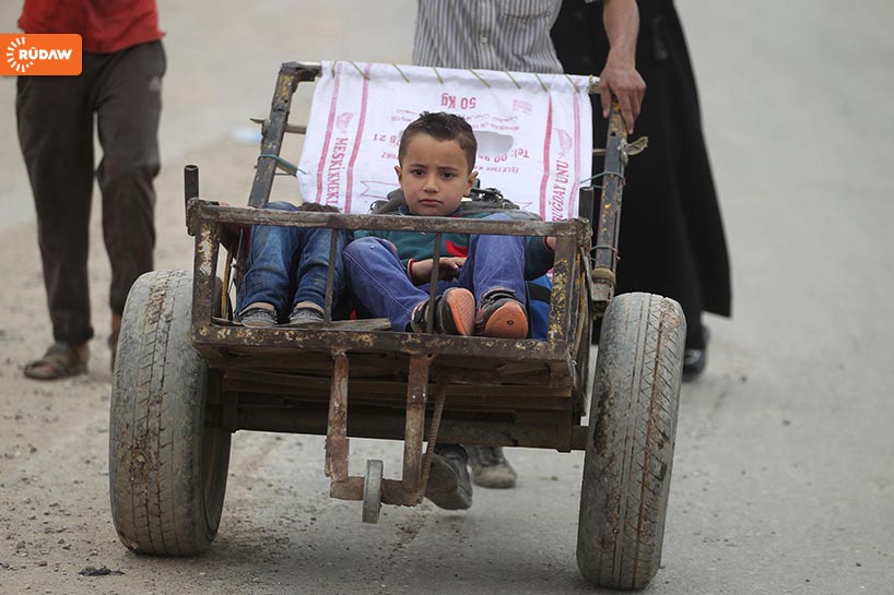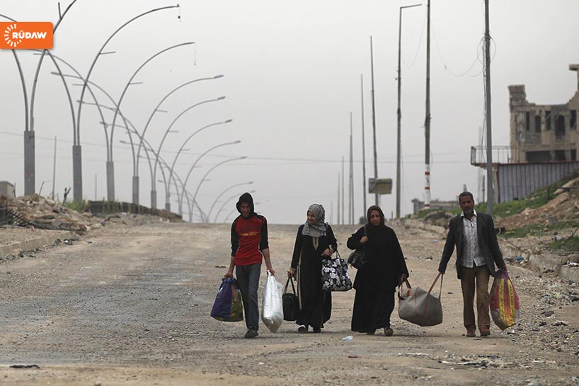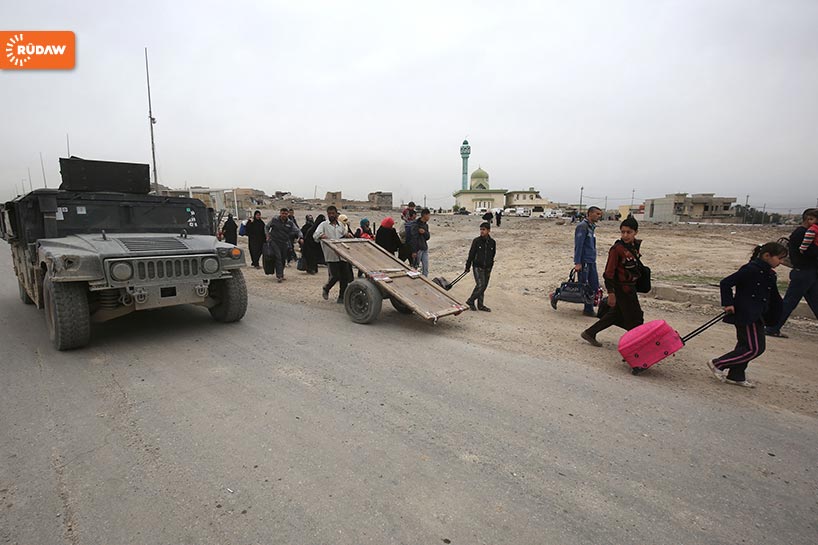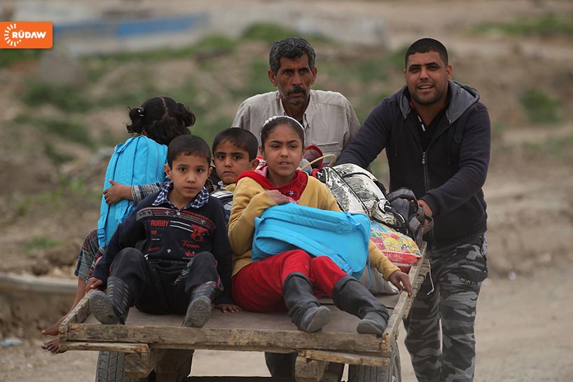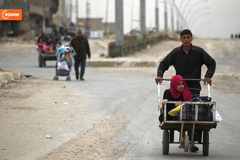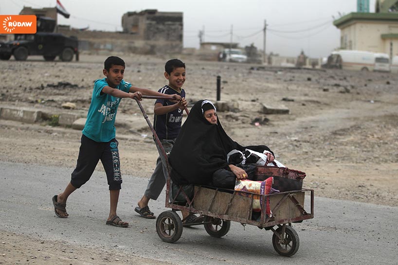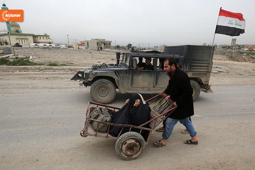 Araba bulamayanlar, tekerlekli pazar tezgahları üzerinde çocuklarını ve eşyalarını taşıyor. 300 binden fazla kişinin evlerini terk ettiği Musul’da çatışmalar, kentin batı yakasında sürüyor.