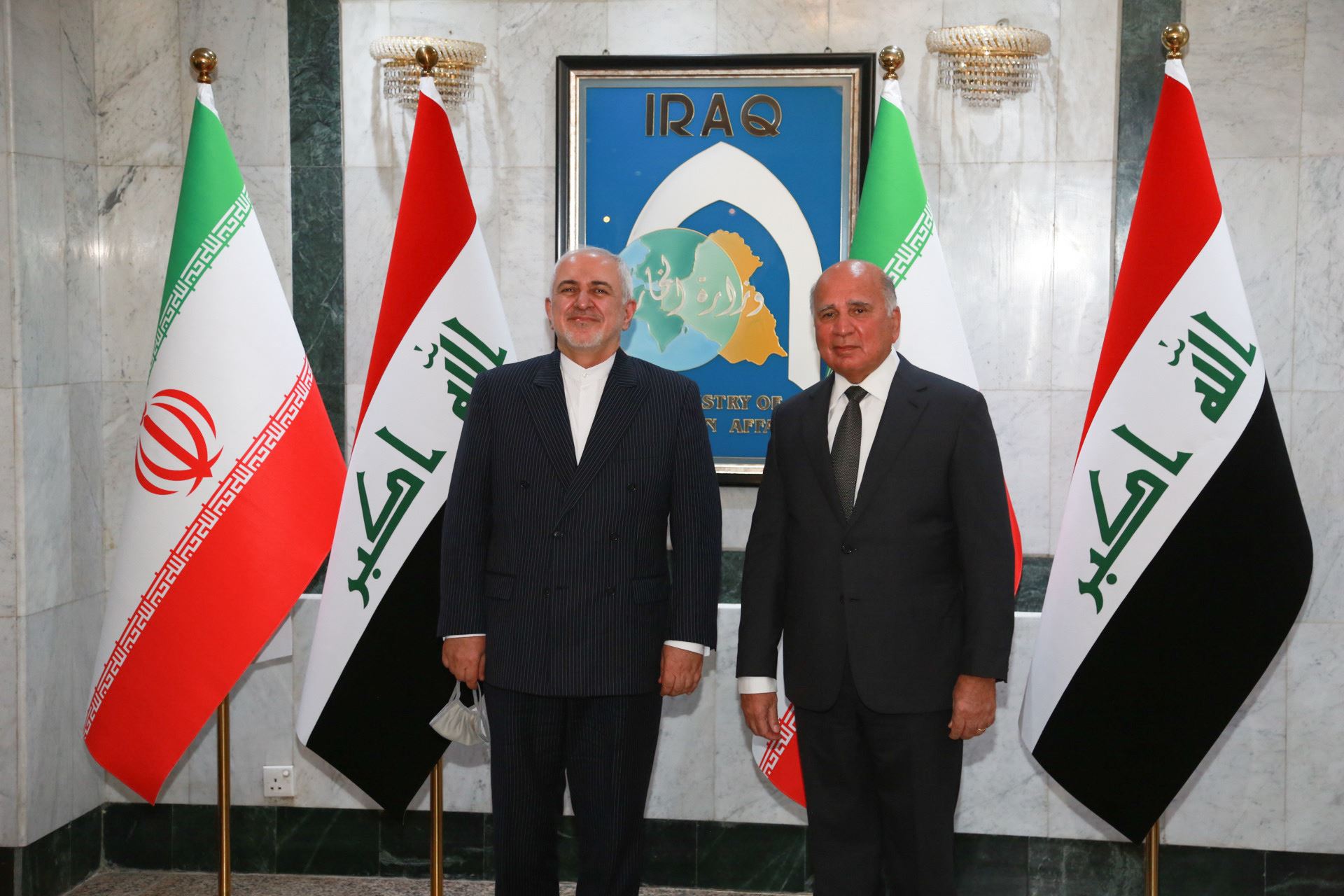 İran Dışişleri Bakanı Muhammed Cevad Zarif , resmi temaslarda bulunmak üzere geldiği Irak'ın başkenti Bağdat'ta, Irak Dışişleri Bakanı Fuad Hüseyin ile bakanlık binasında bir araya geldi.