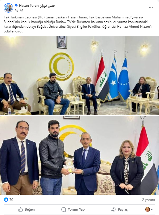 Irak Türkmen Cephesi (ITC) Genel Başkanı Hasan Turan, sosyal medya hesabından yayımladığı mesajında, “Türkmen halkının sesini duyurma konusundaki kararlılığından dolayı” Bağdat Üniversitesi Siyasi Bilgiler Fakültesi öğrencisi Hamza Ahmet Nizam'ı ödüllendirdiğini belirtti.