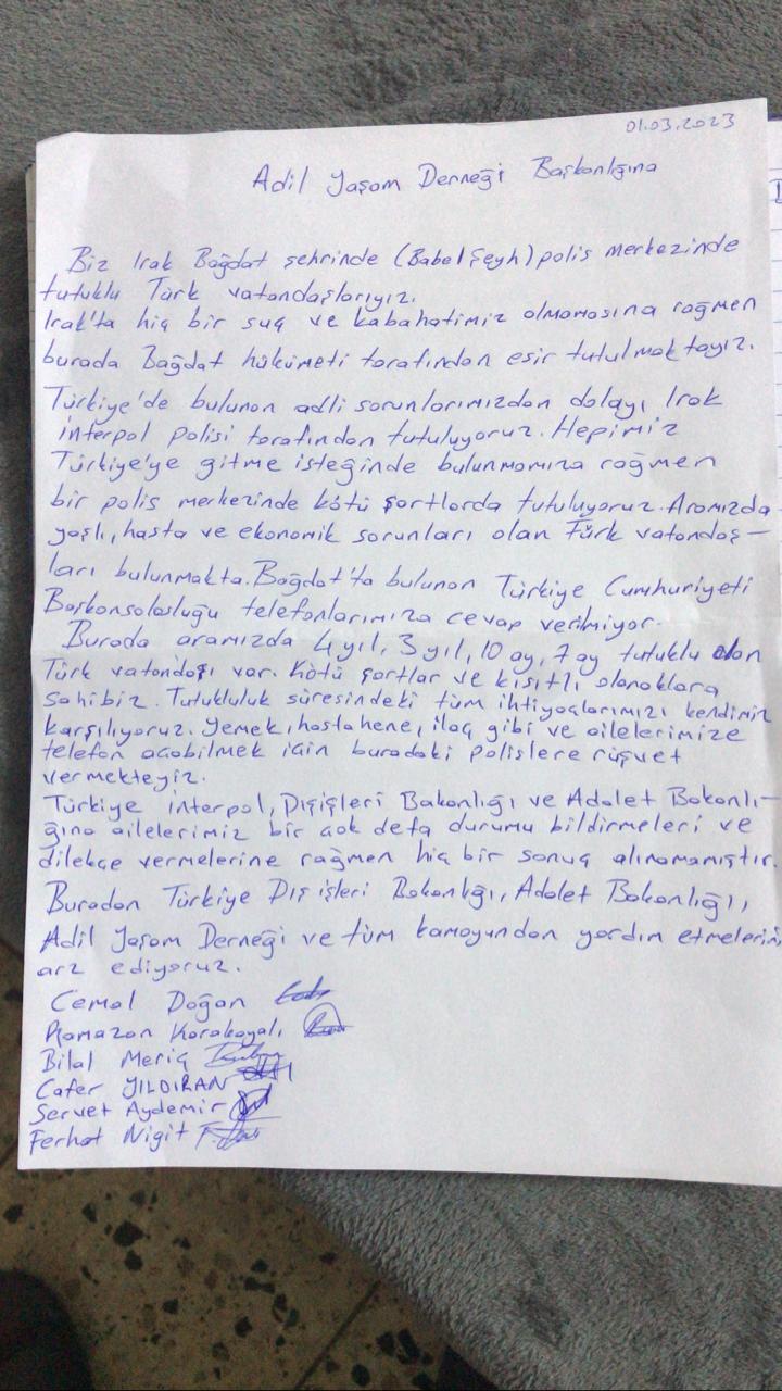 “Biz, Irak Bağdat Şehrinde Babel Şeyh polis merkezinde tutuklu Türk vatandaşlarıyız. Irak'ta hiç bir suç ve kabahatimiz olmamasına rağmen burada Bağdat hükümeti tarafından esir tutulmaktayız. Türkiye'de bulunan adli sorunlarımızdan dolayı Irak İnterpol Polisi tarafından tutuluyoruz. Hepimiz Türkiye'ye gitme isteğinde bulunmamıza rağmen bir polis merkezinde kötü şartlarda tutuluyoruz. Aramızda yaşlı, hasta ve ekonomik sorunları olan Türk vatandaşları bulunmakta. Bağdat'ta bulunan Türkiye Cumhuriyeti Başkonsolosluğu tarafından telefonlarımıza cevap verilmiyor. Burada aramızda 4 yıl, 3 yıl, 10 ay, 7 ay tutuklu olan Türk vatandaşı var. Kötü şartlar ve kısıtlı olanaklara sahibiz. Tutukluluk süresindeki tüm ihtiyaçlarımızı kendi imkanlarımızla karşılıyoruz. Yemek, hastane, ilaç gibi ve ailelerimize telefon açabilmek için buradaki polislere rüşvet vermekteyiz. Türkiye İnterpol, Dışişleri Bakanlığı ve Adalet Bakanlığına ailelerimiz birçok defa durumu bildirmeleri ve dilekçe vermelerine rağmen hiç bir sonuç alınamamıştır. Buradan Türkiye Dışişleri Bakanlığı, Adalet Bakanlığı, Adil Yaşam Derneği ve tüm kamuoyundan yardım etmelerini arz ediyoruz.”
