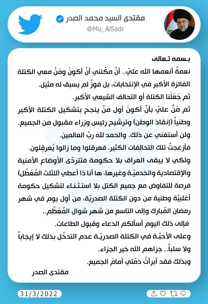 Sadr, sosyal medya hesabı Twitter üzerinden yaptığı paylaşımda, seçim birincisi olduğunu anımsatarak, ancak ülkedeki güvenlik ve ekonomik durumun daha kötüye gitmemesi için Koordinasyon Çerçevesi’ne hükümeti kurma çağrısında bulundu.