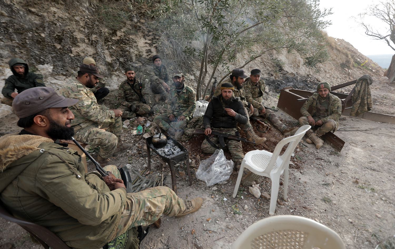 Hama'yı kuşatan HTŞ ve müttefikleri, ülkenin batı-orta kesimindeki Hama'nın kuzey eteklerinde bir mevzide dinlenirken. / (Fotoğraf: Bakr Al Kassem / AFP)