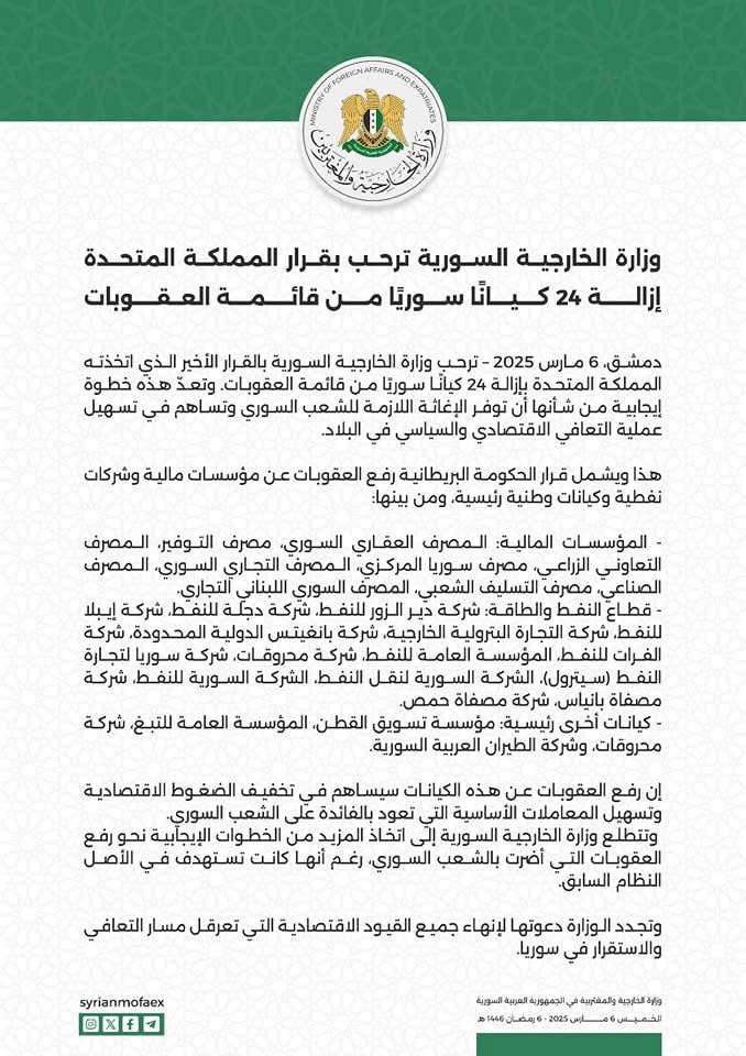 İngiltere Dışişleri Bakanlığı sözcüsünün yazılı açıklamasında, daha önce Esed rejiminin Suriye halkına yönelik baskıları finanse etmek için kullanılan ve aralarında Suriye Merkez Bankası, Suriye Arap Hava yolları ve enerji şirketlerinin de bulunduğu 24 Suriyeli kuruluşa ilişkin yaptırımların kaldırıldığı belirtildi.