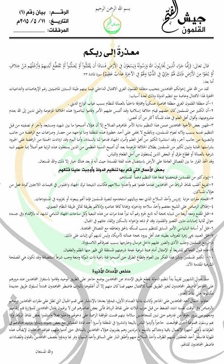 Muhaliflerin Esad rejimine karşı oluşturduğu Fetih Ordusu savaş ilanıyla ilgili bir bildiri yayımladı.