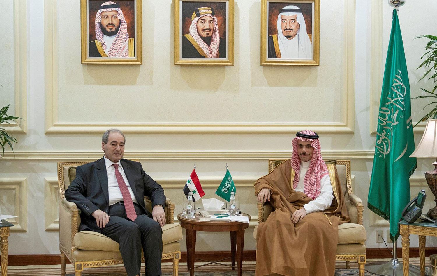 Suriye Dışişleri Bakanı Faysal Mikdat (sağda) Suudi Dışişleri Bakanı Faysal bin Ferhan (solda) ile Cidde'de görüşürken. / 12 Nisan 2023 / AFP
