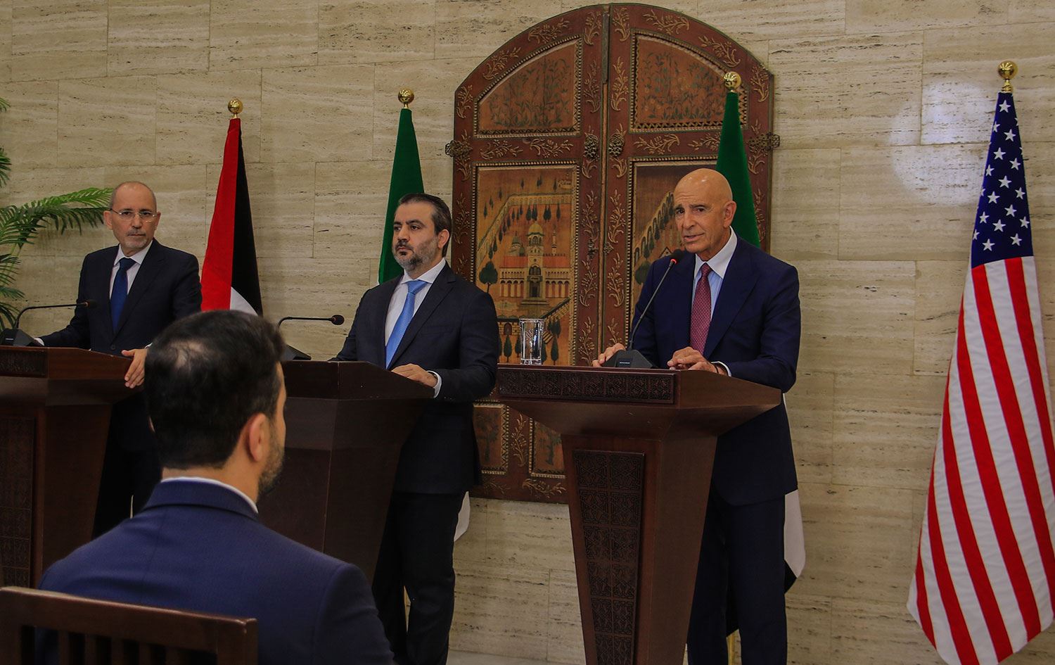 Suriye Dışişleri Bakanı Esad Hasan Şeybani, Ürdün Dışişleri Bakanı Eymen es-Safedi ve ABD'nin Ankara Büyükelçisi ve Suriye Özel Temsilcisi Tom Barrack başkent Şam'daki Tişrin Sarayı'nda bir araya geldi.