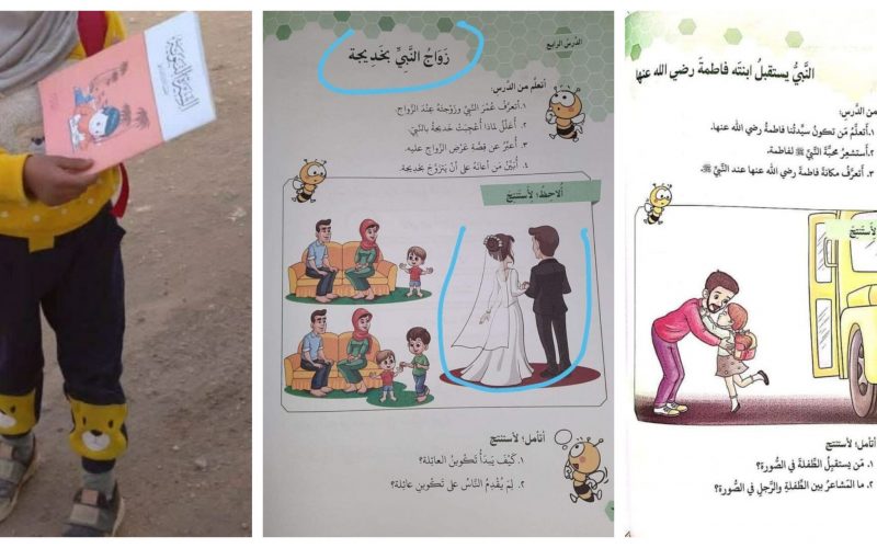 Suriye’nin “muhalif” bölgelerinde yaşayan çocuklar için özel olarak tasarlanan dini ders kitabında, bir resimde pembe bir kazak ve bordo pantolon giymiş sakallı bir kişi, okul otobüsünden inen kızını selamlamak için eğilmiş olarak tasvir ediliyor. Aynı sayfada “Peygamber kızı Fatıma’yı alır” yazıyor.