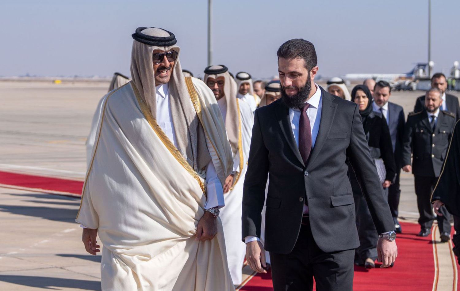 Katar Emiri Şeyh Temim bin Hamad Al Sani, Suriye’nin geçici devlet başkanı Ahmed el-Şara tarafından karşılandı.