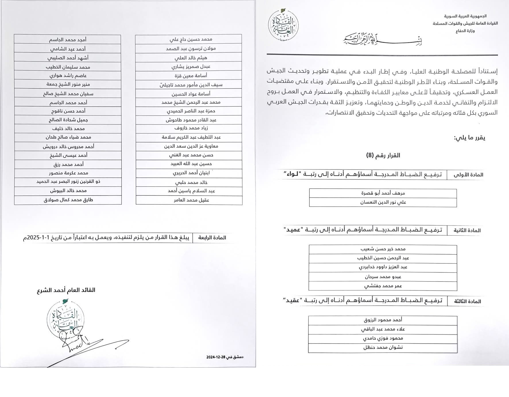 Ardından ordu bünyesindeki ilk terfi ve atamalar gerçekleştirildi. Başkomutan sıfatıyla Ahmed eş-Şera, diğer adıyla Ebu Muhammed el-Colani imzasıyla yeni bir kararname yayınlanarak 49 kişilik bir atama listesi yayınlandı. Karar, Mart ayına kadar geçerliliğini koruyacak.