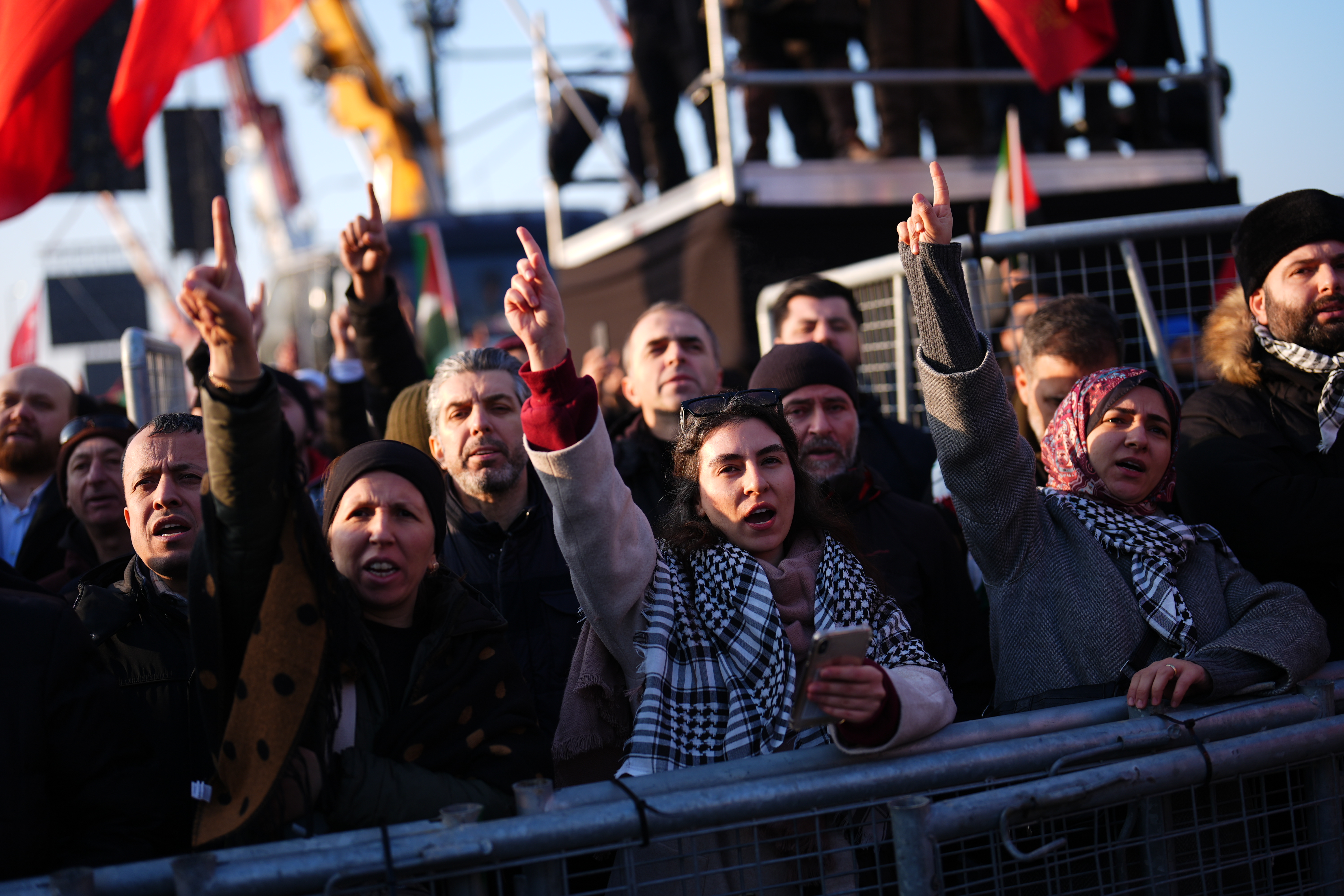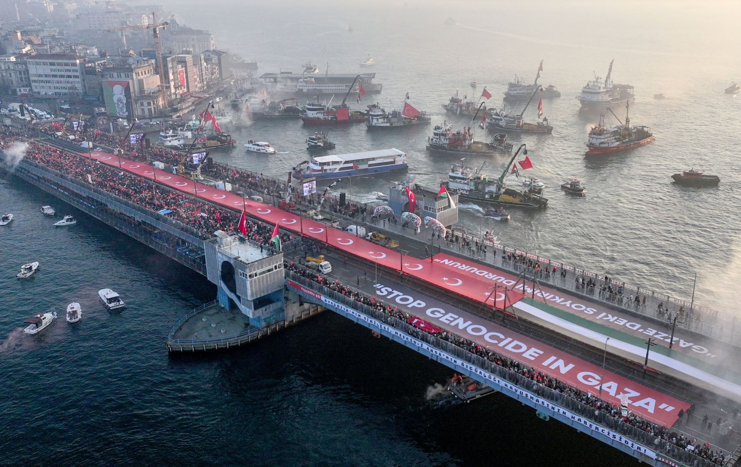 400 sivil toplum kuruluşunun katılımıyla İsrail'in Filistin'deki katliamını protesto etmek için Galata Köprüsü üzerinde 'Büyük Filistin Yürüyüşü' düzenlendi. Yürüyüş öncesi çok sayıda kişi sabah namazı için Ayasofya'da bir araya geldi.