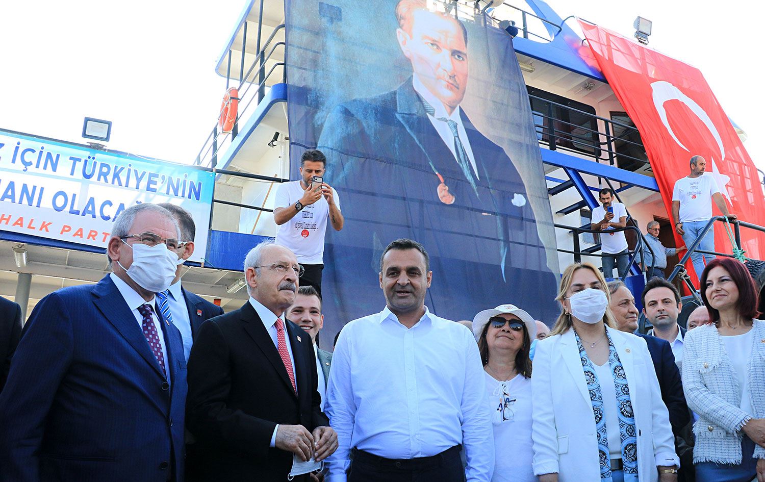 Kıyı şeridinde çalışma yapacak CHP gemisini buradan uğurlayan Kılıçdaroğlu, denize çiçek bıraktı.