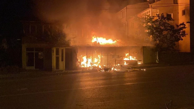 Sosyal medyada yayılan videolarda toplanan öfkeli kalabalık Suriyelilere ait iş yerleri ve araçları ateş verdi