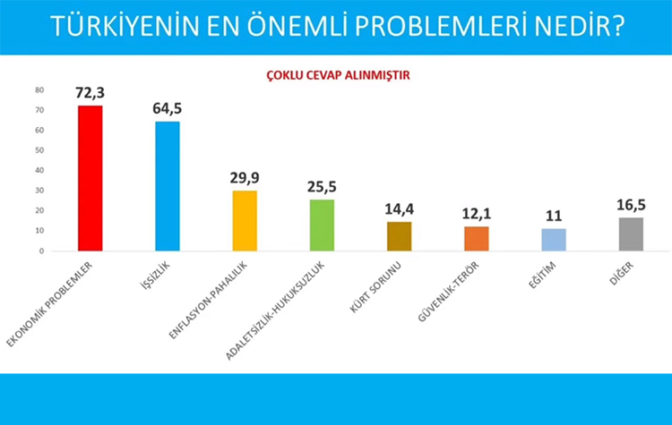 Araştırmanın sonuçlarına göre, ankete katılanlar Türkiye’nin en büyük sorunu olarak ekonomi ve işsizliğe işaret etti.