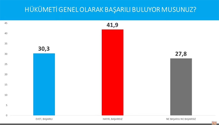“Hükümeti genel olarak başarılı buluyor musunuz?” yanıtına ise yurttaşların yüzde 41’i, “Hayır, başarısız” yanıtını verdi: