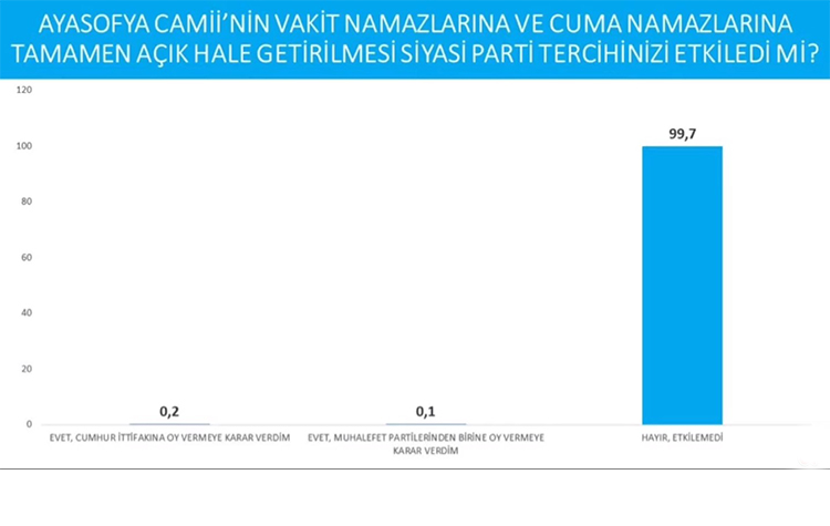 Araştırmaya katılan Türkiye vatandaşları, Ayasofya’nın cami olarak açılmasının siyasi tercihlerini etkilemediğini belirtti.