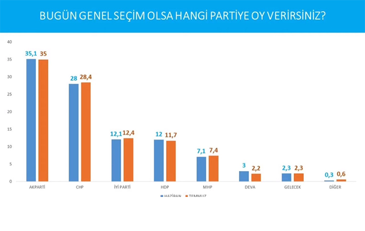 “Bugün Seçim olursa hangi partiye oy verirsiniz” sorusunu yanıtlayan katılımcıların yüzde 35’i AK Parti’, yüzde 28,4’ü CHP, yüzde 12,4’ü İYİ Parti, yüzde 11, 7’si HDP, yüzde 7,4’ü MHP dedi.