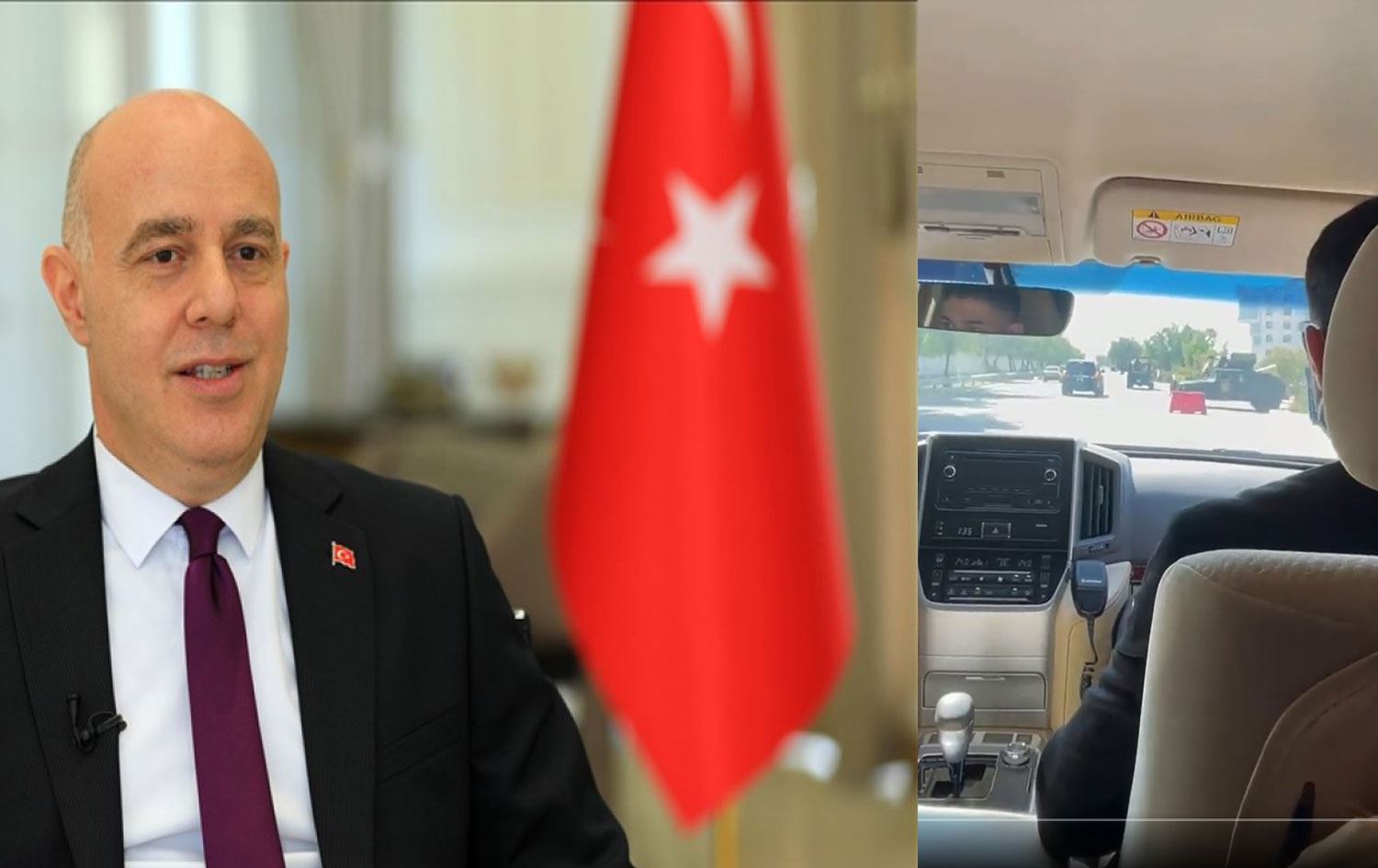 Güney’in paylaşımında yer alan videoda, makam aracında bulunan büyükelçinin Kurtlar Vadisi müziği eşliğinde büyükelçilik binasına girdiği görülüyor.