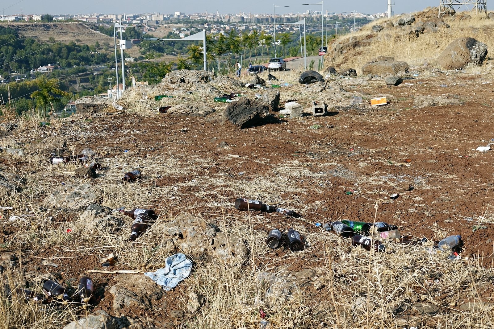 Diyarbakır’da Dicle Nehri kenarında bulunan Kırklar Dağı’nda çevreye atılan boş alkol şişeleri ve çöp atıklarından geçilmiyor.