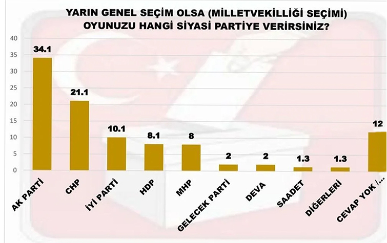 Ankete göre, kararsızlar dağıtıldıktan sonra oy kullanacağını söyleyen seçmenlerin yüzde 38,7'si AK Parti'ye, yüzde 24'ü CHP'ye, yüzde 11,6'sı ise İYİ Parti'ye oy verecek. Araştırmaya göre HDP ve MHP ise baraj altında kalıyor.