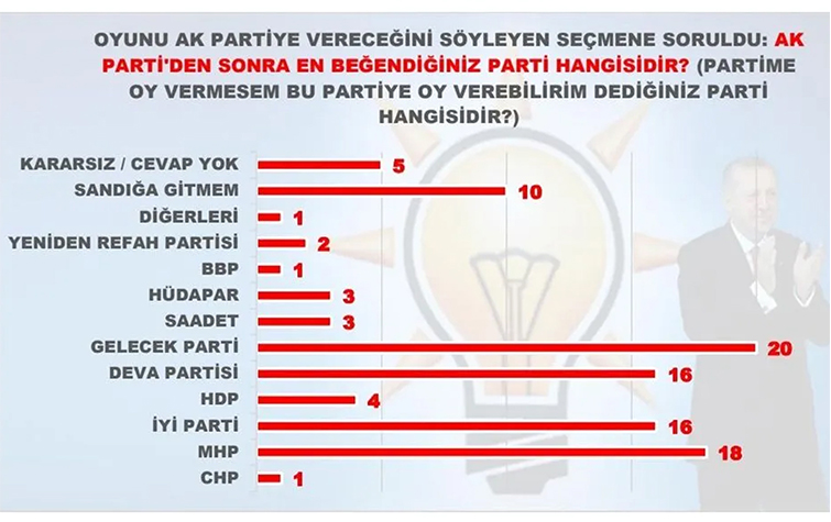 Oyunu AK Parti'ye vereceğini söyleyen seçmenlere "AK Parti'den sonra en beğendiğiniz parti hangisidir?" diye soruldu. En yüksek oranı yüzde 20 ile Gelecek Partisi aldı. AK Parti ile Cumhur İttifakı'nda yer alan MHP ise yüzde 18 ile ikinci sırada bulundu.