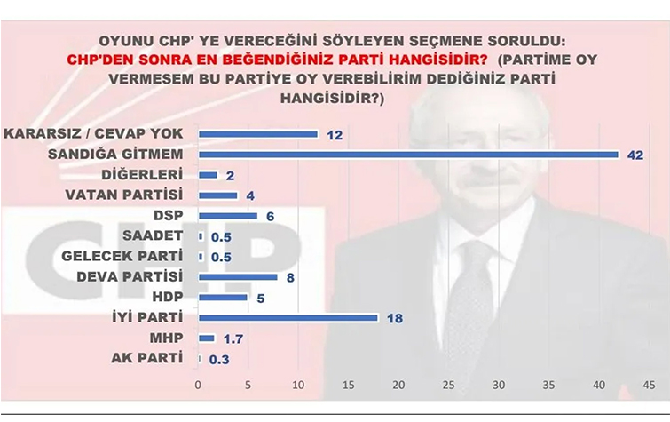 Aynı soru CHP'li seçmene sorulduğunda yüzde 42'si sandığa gitmeyeceğini açıkladı. Yüzde 18'i ise İYİ Parti'ye oy verebileceğini belirtti.