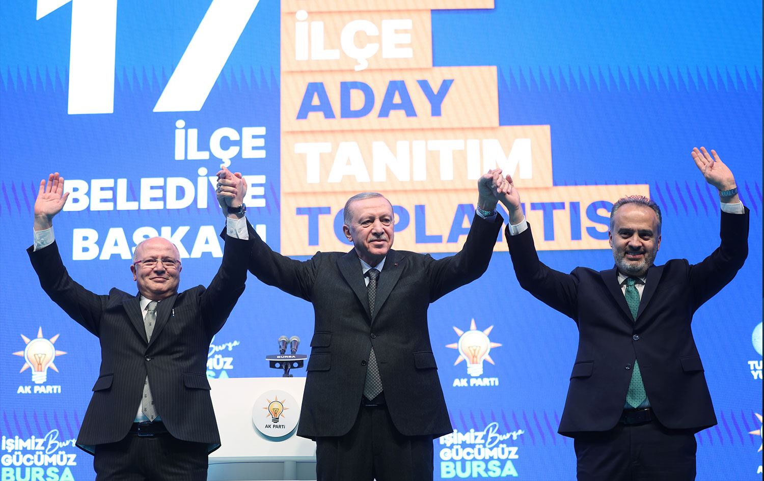 Erdoğan, Büyükorhan Belediye Başkan adayının Kamil Turhan, Gemlik Belediye Başkan adayının Refik Yılmaz, Gürsu Belediye Başkan adayının Mustafa Işık, Harmancık Belediye Başkan adayının Yılmaz Ataş, İnegöl Belediye Başkan adayının Alper Taban, İznik Belediye Başkan adayının Kağan Mehmet Usta, Karacabey Belediye Başkan adayının Ali Özkan, Keles Belediye Başkan adayının Ali Doğru, Kestel Belediye Başkan adayının Ferhat Erol, Mudanya Belediye Başkan adayının Gökhan Dinçer, Mustafakemalpaşa Belediye Başkan adayının Ahmet Beygirci, Nilüfer Belediye Başkan adayının Celil Çolak, Orhaneli Belediye Başkan adayının Ali Osman Tayır, Orhangazi Belediye Başkan adayının Bekir Aydın, Osmangazi Belediye Başkan adayının Mustafa Dündar, Yenişehir Belediye Başkan adayının Davut Aydın ve Yıldırım Belediye Başkan adayının Oktay Yılmaz olduğunu açıkladı.
