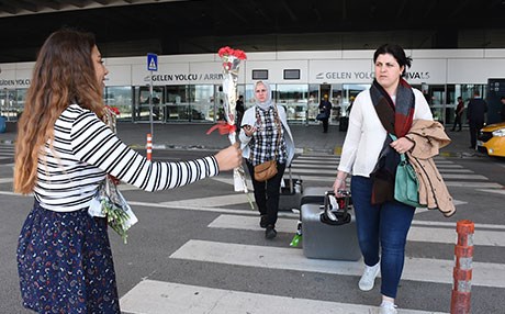 Corendon Hava Yolları ile gelen İsrail ve Filistinli 180 turiste havalimanı çıkışında lokum ikram edildi ve karanfiller verildi.