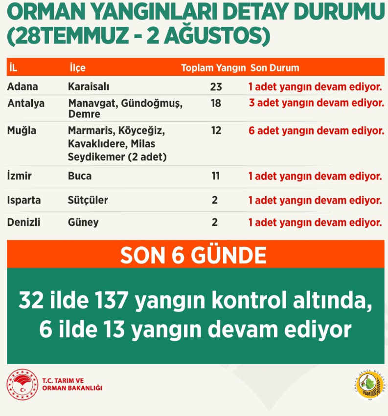 Bekir Pakdemirli, Twitter hesabından ülkenin farklı yerlerinde kontrol altına alınan ve devam eden yangınlara ilişkin bilgiler verdi. Buna göre 28 Temmuz - 2 Ağustos günleri arasında 32 ilde çıkan 137 yangın kontrol altına alındı. 6 ilde 13 yangın ise devam ediyor.