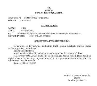Haber Merkezi – Zafer Partisi Genel Başkanı Ümit Özdağ'a Ankara Cumhuriyet Başsavcılığı tarafından soruşturma açıldı. Özdağ, hakkında alınan karara sosyal medya hesabından yaptığı paylaşımla tepki gösterdi.