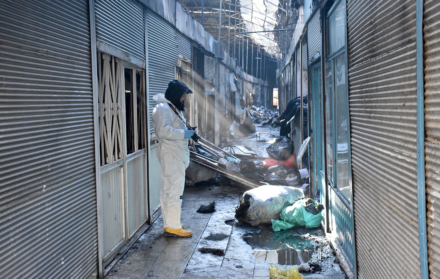Van'ın İpekyolu ilçesinde dün çıkan yangın sonucu birçok dükkanın kullanılamaz hale geldiği Mısır Çarşısı'nda ekiplerin incelemesi devam ediyor. / Foto: AA