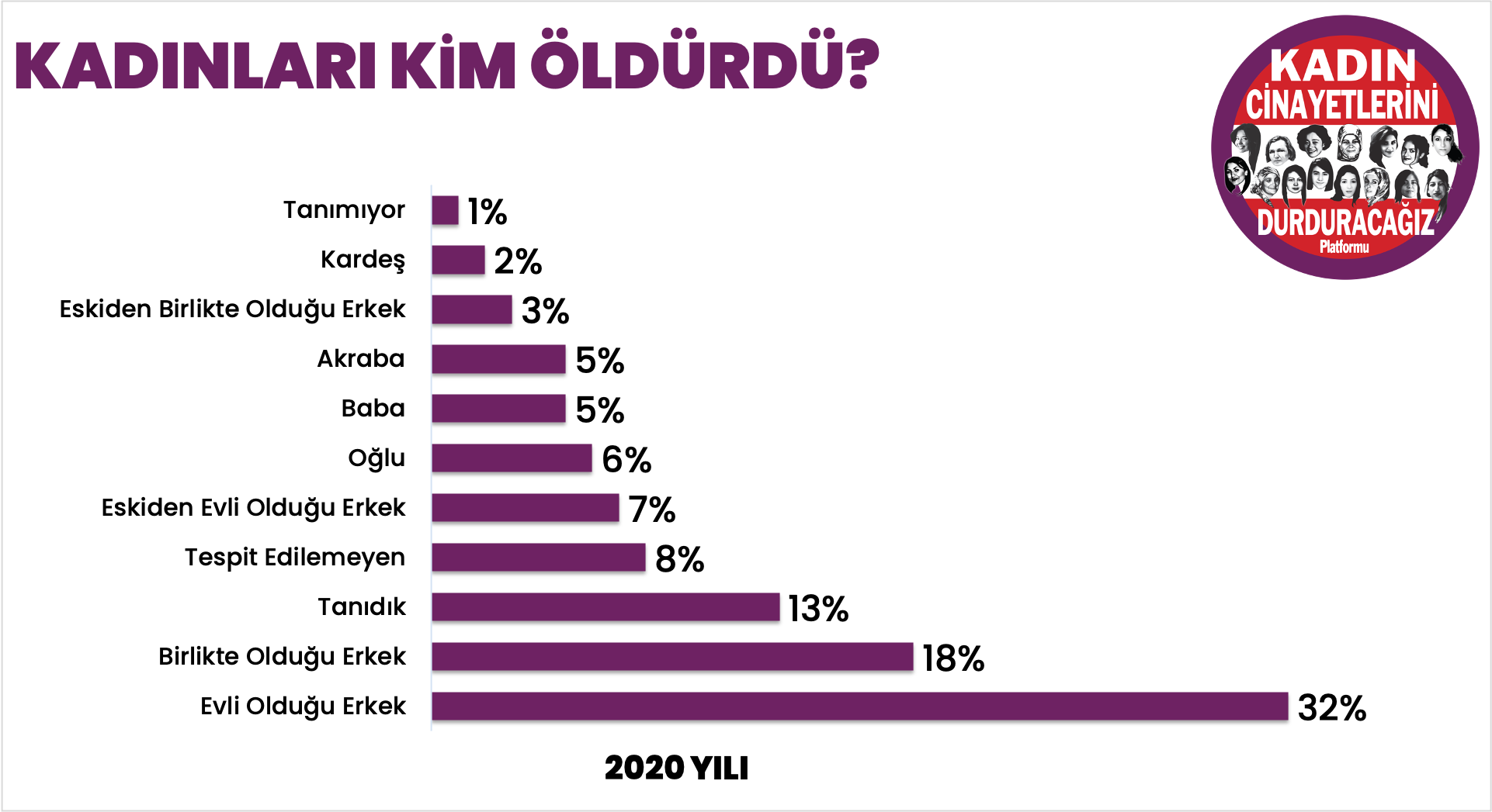 2020 yılında öldürülen 300 kadının 97'si evli olduğu erkek, 54'ü birlikte olduğu erkek, 38'i tanıdık birisi, 21'i eskiden evli olduğu erkek, 18'i oğlu, 17'si babası, 16'sı akraba, 8'i eskiden birlikte olduğu erkek, 5'i kardeşi, 3'ü tanımadığı birisi tarafından öldürüldü. 23 kadının ölümüne sebep olan kişilerin yakınlık durumu tespit edilemedi.