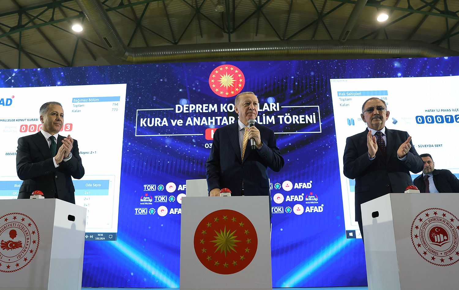 Erdoğan, “Vatandaşlarımız müsterih olsun. Devletlerine ve bize güvensin. Kimsenin hakkı yerde kalmayacak, kimse mağdur olmayacak. Amacımız, takip eden dönemde de her ay 15-20 bin konut ve köy evini hak sahipleriyle buluşturmaktır. Temel atmasının üzerinden 1 yıl geçmeden inşaatları bitirme sözümüzü önemli ölçüde yerine getirerek, yıl sonuna kadar 200 bin evi teslim etmiş olacağız. İnşallah 2 ay içinde deprem bölgesi genelinde 75 bin konutun teslimini bitireceğiz. Hedeflerimize doğru yürürken deprem, terör, ekonomik tuzaklar başta önümüzdeki muhtemel tehditleri de birer birer bertaraf etme kararlılığındayız” dedi.