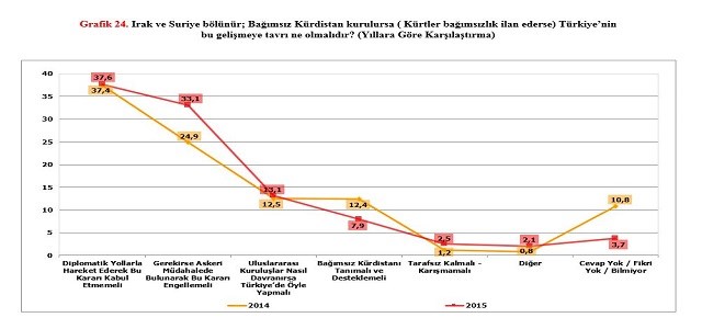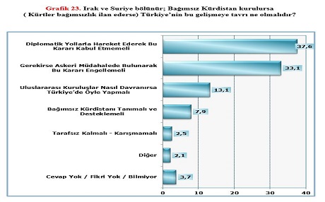 “Katılımcıların %37,6’sı, “diplomatik yollarla hareket ederek bu kararı kabul etmemeli’, %33,1’i, ‘gerekirse askeri müdahalede bulunarak bu kararı engellemeli’, %13,1’i ‘uluslararası kuruluşlar nasıl davranırsa Türkiye’de öyle yapmalı’, %7,9’u ise ‘Bağımsız Kürdistan tanınmalı ve desteklemeli’ yanıtını verdi.”