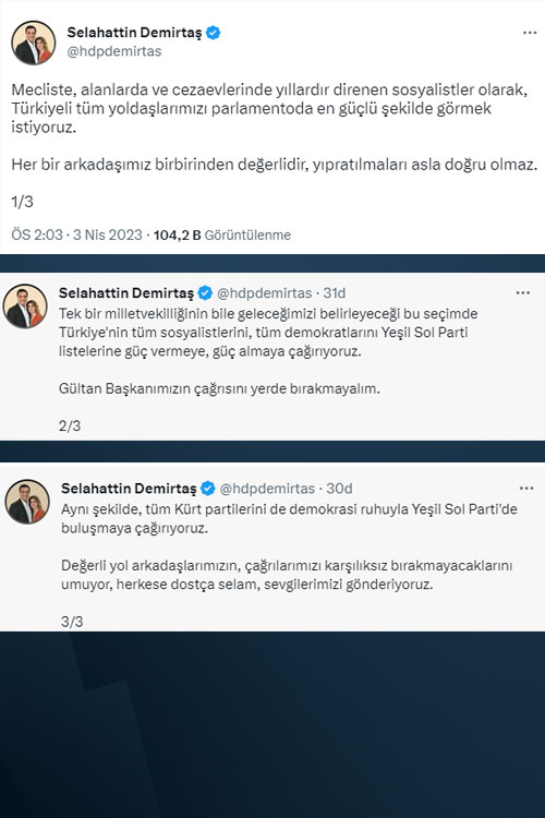 Haber Merkezi – HDP Eski Eş başkanı Selahattin Demirtaş, “Tek bir milletvekilliğinin bile geleceğimizi belirleyeceği bu seçimde Türkiye'nin tüm sosyalistlerini, tüm demokratlarını Yeşil Sol Parti listelerine güç vermeye, güç almaya çağırıyoruz. Gültan Başkanımızın çağrısını yerde bırakmayalım” ifadelerini kullandı.