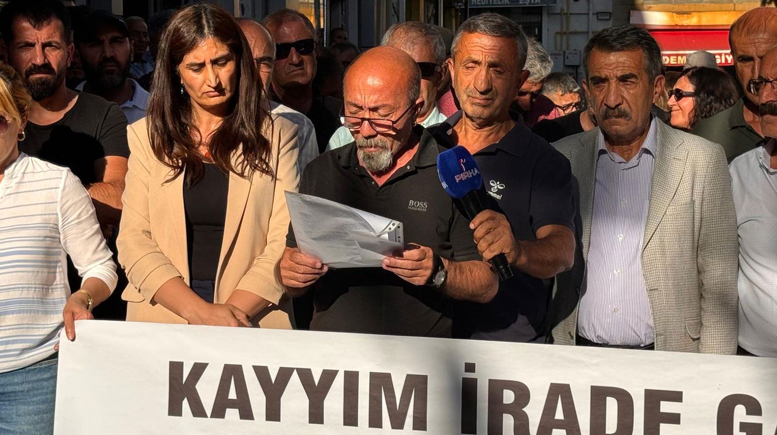 “Kayyım irade gaspıdır, bu kararı tanımıyoruz, faşizme boyun eğmeyeceğiz” pankartının açıldığı açıklamayı DEM Parti İl Başkanı Özcan Gürtaş okudu.