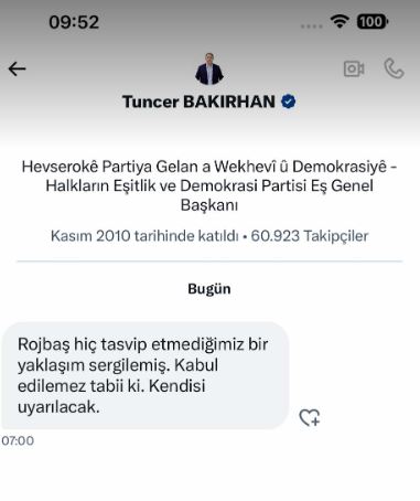 Basın özgürlüğüne yapılan bu aleni saldırı üzerine DEM Parti Eş Genel Başkanı Tuncer Bakırhan, Rawin Sterk’e mesaj göndererek “Rojbaş. Hiç tasvip etmediğimiz bir yaklaşım sergilenmiş. Kabul edilemez tabii ki. Kendisi uyarılacak” dedi.