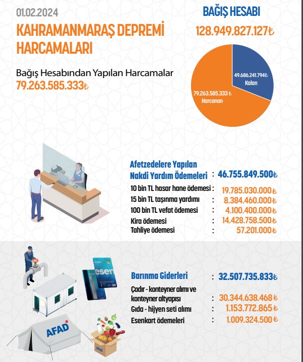 Haber Merkezi - AFAD, Maraş merkezli depremlerin ardından yapılan bağış ve harcama tutarını açıkladı. Buna göre; 128 milyar 949 milyon liralık yardım toplandı. Yardım hesaplarından harcanan para ise 79 milyar 263 milyon oldu.