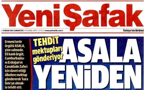 Yeni Şafak gazetesinde “ASALA yeniden sahnede” başlıklı manşet haberde ASALA’nın Cumhurbaşkanı Recep Tayyip Erdoğan’ın Çanakkale Zaferi için davet ettiği ülkelere mektup göndererek “kara liste”ye almakla tehdit ettiği iddia edildi. Haberde şöyle denildi: