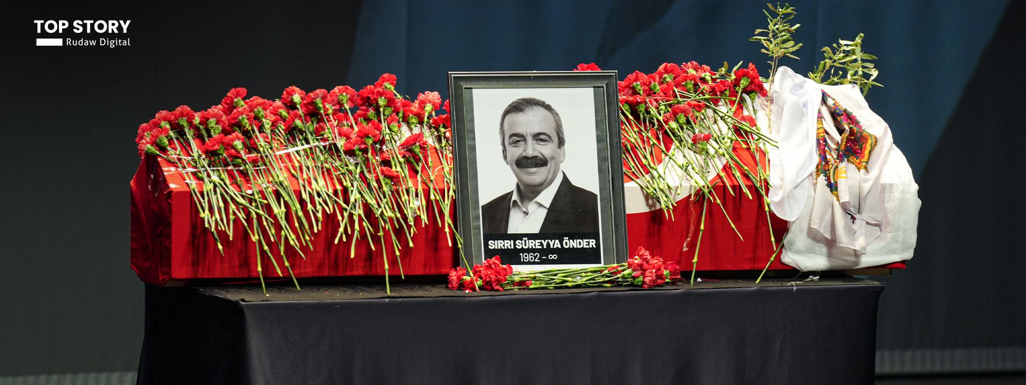 Taziye çadırının önüne Sırrı Süreyya Önder’in fotoğrafı asılırken, çadırın içine Önder’in fotoğraflarının yer aldığı “Şehîdê aştî û demokrasiye/Demokrasi ve barış şehidi” yazılı pankartlar asıldı.