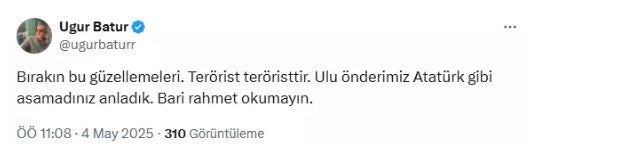 Batur, X hesabından paylaştığı mesajda "Bırakın bu güzellemeleri. Terörist teröristtir. Ulu önderimiz Atatürk gibi asamadınız, anladık. Bari rahmet okumayın" ifadelerini kullandı.