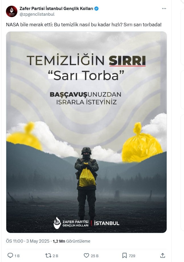 Zafer Partisi Gençlik Kolları Başkanlığının sosyal medya hesabından yapılan paylaşımda “NASA bile merak etti: Bu temizlik nasıl bu kadar hızlı? Sırrı sarı torbada!” ifadelerine yer verildi.