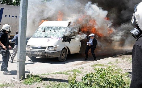 Bu sırada gruba, karşıt görüşlü bir grup taşla saldırdı. Polis, yine biber gazı ve TOMA'lardan sıktığı tazyikli su ile gruba karşılık verdi.