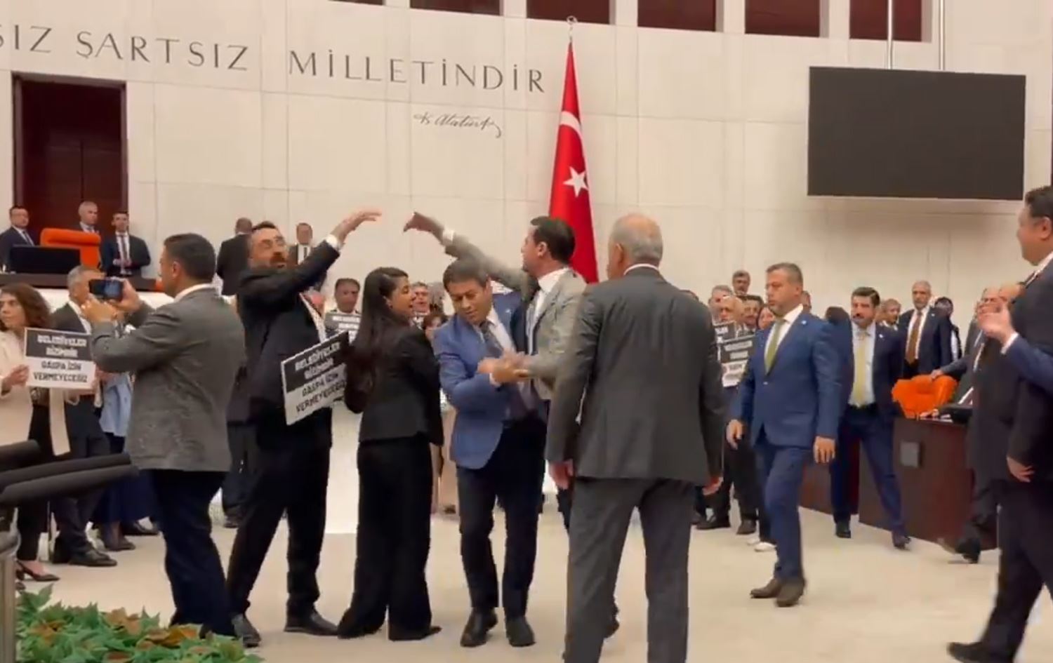 DEM Parti milletvekilleri, Hakkari Belediye Başkanı'nın görevden alınmasını ve belediyeye kayyım atanmasını protesto etmek için Genel Kurul'da kürsü eylemi yaptığı esnada, AK Partili vekiller pankartları almak istedi.