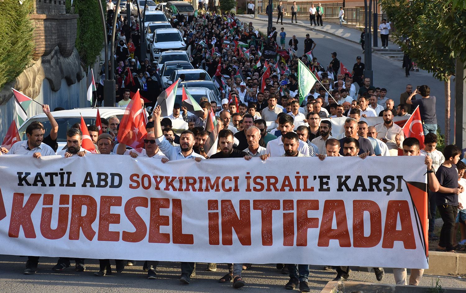 Buradan hareket eden kalabalık, ellerinde Filistin bayraklarıyla tekbir getirip, İsrail aleyhine slogan atarak 15 Temmuz Demokrasi ve Şehitler Parkı'na kadar yürüdü.